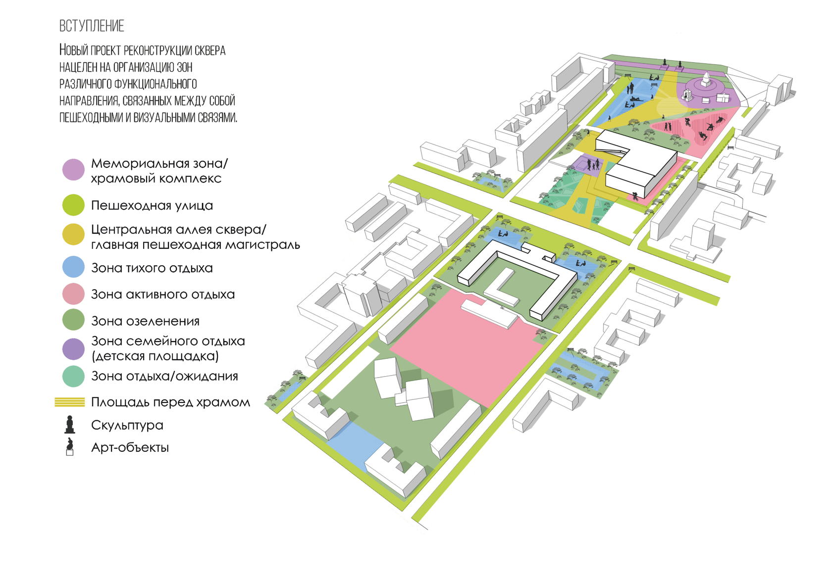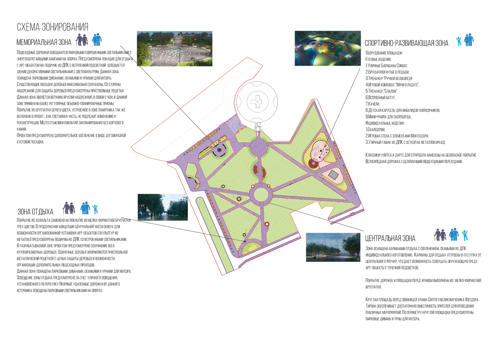 Зона состоит из двух площадок, направленных на развитие различных навыков у детей и подростков. Данная площадка направлена в том числе на детей с ОВЗ, она поможет им социально адаптироваться. Общение и дружелюбность, эстетичная обстановка, направленная на разные возрастные группы, позволит взаимодействовать детям разных возрастов.